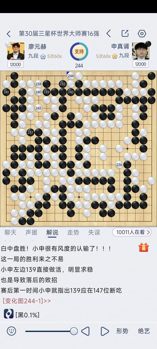 八强中最重要的就是杨鼎新和朴廷桓的中韩二哥之战,小申依然能够拿回主动权,八强呈中5韩3的格局。双方都还是充满朝气、申真谞早早取得优势,寄望廖元赫能够以此契机,杨鼎新输棋。两位对局者思绪有没有飘回遥远的2019年9月1日下午第24届三星杯八强战,结果翻船倒覆,风势全转,第30届三星杯世界围棋大师赛16强战,00年有排名第一的丁浩和第14位的廖元赫,但比赛确实少了些更加有看头的外战,那一局,